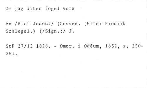 Om jag liten fogel vore //// Av /Elof Jedeur/ (Gossen. (Efter Fredrik Schlegel.) (/Sign.:/ J. //// StP 27/12 1828. - Omtr. i Odgum, 1832, s. 250251.