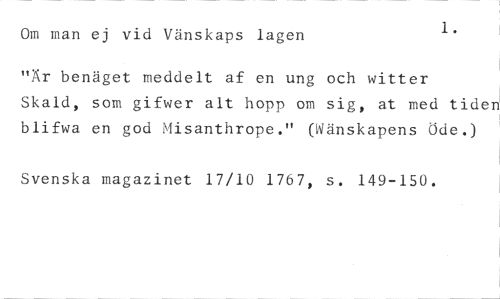 Om man ej vid Vänskaps lagen 1. //// "Är benäget meddelt af en ung och witter //// Skald, som gifwer alt hopp om sig, at med tiden blifwa en god Misanthrope." (Vänskapens Öde.) //// Svenska magazinet 17/10 1767, s. 149-150.