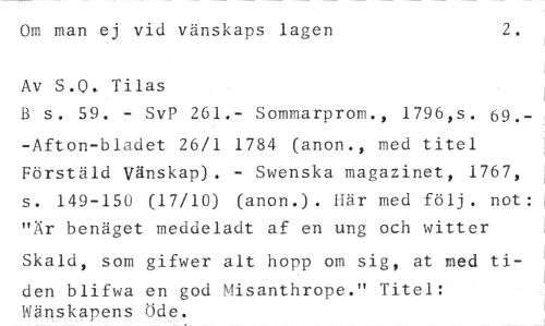 Om man ej vid vänskaps lagen 2. //// Av S.O. Tilas //// B s. 59. - SvP 261.- Sommarprom., 1796,s. 69.- //// -Afton-bladet 26/1 1784 (anon., med titel Förstäld Vänskap). - Swenska magazinet, 1767, s. 149-150 (17/10) (anon.). Här med följ. not: "Är benäget meddeladt af en ung och witter //// Skald, som gifwer alt hopp om sig, at med ti- //// den blifwa en god Misanthrope." Titel: Wänskapens öde.