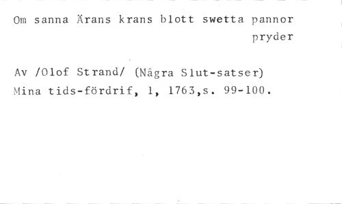 Om sanna Ärans krans blott swetta pannor //// pryder //// Av /Olof Strand/ (Några Slut-satser) Mina tids-fördrif, 1, 1763,s. 99-100.
