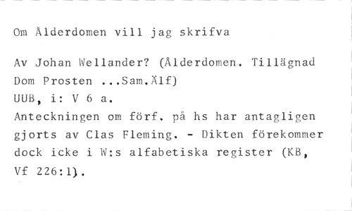 Om Ålderdomen vill jag skrifva //// Av Johan Wellander? (Ålderdomen. Tillägnad Dom Prosten ...Sam.Älf) //// UUB, i: V 6 a. //// Anteckningen om förf, på hs har antagligen gjorts av Clas Fleming. - Dikten förekommer dock icke i W:s alfabetiska register (KB, Vf 226:1).