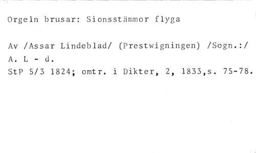 Orgeln brusar: Sionsstämmor flyga //// Av /Assar Lindeblad/ (Prestwigningen) /Sogn.:/ A. L - d. //// StP 5/3 1824; omtr. i Dikter, 2, 1833,s. 75-78.