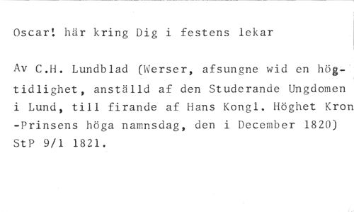 Oscar: här kring Dig i festens lekar //// Av C.H. Lundblad (Werser, afsungne wid en hög- tidlighet, anställd af den Studerande Ungdomen i Lund, till firande af Hans Kongl. Höghet Kron -Prinsens höga namnsdag, den i December 1820) StP 9/1 1821.