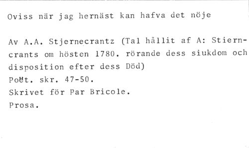Oviss när jag hernäst kan hafva det nöje //// Av A.A. Stjernecrantz (Tal hållit af A: Stierncrants om hösten 1780. rörande dess sjukdom och disposition efter dess Död) //// Poet. skr. 47-50. //// Skrivet för Par Bricole. //// Prosa.