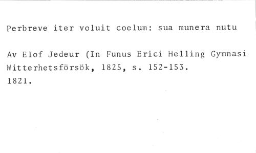Perbreve iter voluit coelum: sua munera nutu //// Av Elof Jedeur (In Funus Erici Helling Gymnasi Witterhetsförsök, 1825, s. 152-153. 1821.
