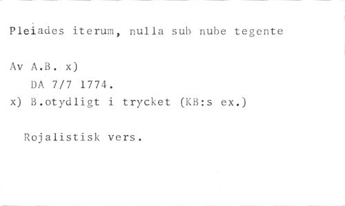 Pleiades iterum, nulla sub nulut tegente //// Av A.B. x) //// DA 7/7 1774. //// x) B.otydligt i trycket (KB:s ex.) //// Rojalistisk vers.
