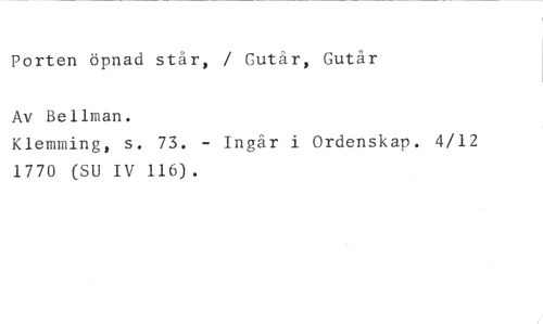 Porten öpnad står, / Gutår, Gutår //// Av Bellman. //// Klemming, s. 73. - Ingår i Ordenskap. 4/12 1770 (SU IV 116).