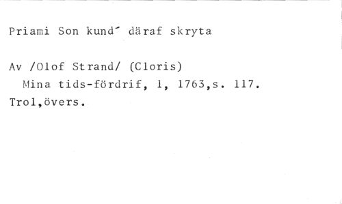 Priami Son kund- däraf skryta //// Av /Olof Strand/ (Cloris) //// Mina tids-fördrif, 1, 1763,s. 117. Trol,övers.