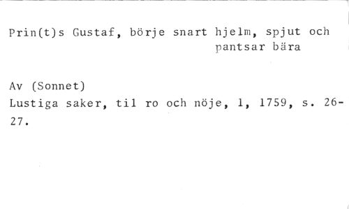 Prin(t)s Gustaf, börje snart hjelm, spjut och //// pantsar bära //// Av (Sonnet) //// Lustiga saker, til ro och nöje, 1, 1759, s. 2627.