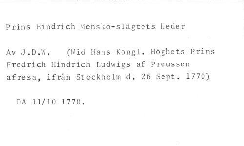 Prins Hindrich Mensko-slägtets Heder //// Av J.D.W. (Wid Hans Kongl. Höghets Prins //// Fredrich Hindrich Ludwigs af Preussen afresa, ifrån Stockholm d. 26 Sept. 1770) //// DA 11/10 1770.