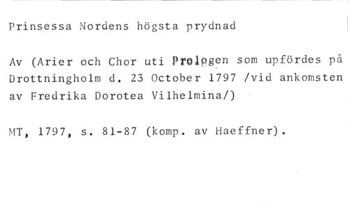 Prinsessa Nordens högsta prydnad //// Av (Arier och Chor uti Prolpgen som upfördes på Drottningholm d. 23 October 1797 /vid ankomsten av Fredrika Dorotea Vilhelmina/) //// MT, 1797, s. 81-87 (komp. av Haeffner).