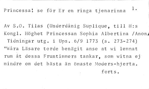 Princessa! se för Er en ringa tjenarinna 1. //// Av S.O. Tilas (Underdånig Suplique, till H:s Kongl. Höghet Princessan Sophia Albertina /Anon4 //// Tidningar utg. i Ups..6/9 1773 (s. 273-274) "svåra Läsare torde benägit anse at wi lemnat rum åt dessa Fruntimmers tankar, som witna ej mindre om det bästa än ömaste Moders-hjerta. //// forts.