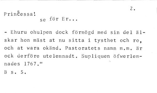 2. //// Prin8essa: //// se för Er... //// - Ehuru ohulpen dock förnögd med sin del älskar hon mäst at nu sitta i tysthet och ro, och at wara okänd. Pastoratets namn m.m. är ock derföre utelemnadt. Supliquen öfwerlemnades 1767." //// B s. 5.