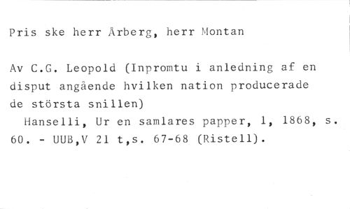 Pris ske herr ;yrberg, herr Montan //// Av C.G. Leopold (Inpromtu i anledning af en disput angående hvilken nation producerade de största snillen) //// Hanselli, Ur en samlares papper, 1, 1868, s. 60. - UUB,V 21 t,s. 67-68 (Ristell).