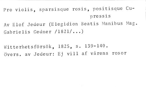 Pro violis, sparsisque rosis, positisque Cu- //// pressis //// Av Elof Jedeur (Elegidion Beatis Manibus Mag. Gabrielis Gedner /1821/...) //// Vitterhetsförsök, 1825, s. 139-140. //// Övers. av Jedeur: Ej vill af vårens rosor