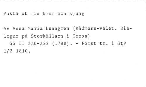 Pusta ut min bror och sjung //// Av Anna'Maria Lenngren (Rådmans-valet. Dialogue på Storkällarn i Trosa) //// SS II 330-322 (1798). - Först tr. i StP 1/2 1810.