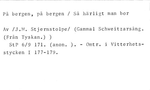 På bergen, pä bergen / Så härligt man bor //// Av /J.M. Stjernstolpe/ (Gammal Schweitzarsäng. (Frän Tyskan.) ) //// StP 6/9 171. (anon. - Omtr. i Vitterhets- //// stycken I 177-179.