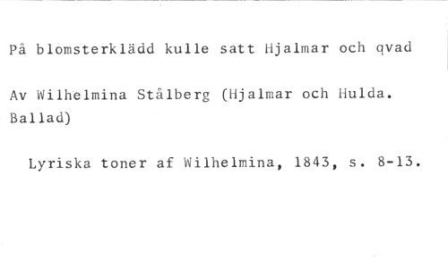 På blomsterklädd kulle satt Hjalmar och evad //// Av Wilhelmina Stålberg (Hjalmar och Hulda. Ballad) //// Lyriska toner af Wilhelmina, 1843, s. 8-13.