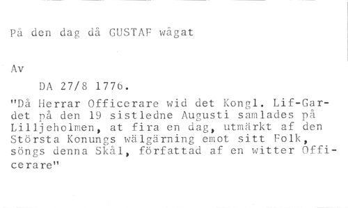 På den dag då GUSTAF wågat //// DA 27/8 1776. //// "Då Herrar Officerare wid det Kongl. Lif-Gardet på den 19 sistledne Augusti samlades på Lilljeholmen, at fira en dag, utmärkt af den Största Konungs wälgärning emot sitt Folk, söngs denna Skål, författad af en witter Offi- //// cerare"
