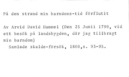 Pä den strand min barndoms-tid förflutit //// Av Arvid David Hummel (Den 25 Junii 1799, vid ett besök på landsbygden, där jag tillbragt min barndom) //// Samlade skalde-försök, 1800,s. 93-95.