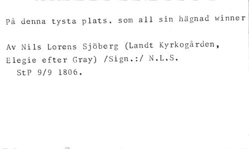 På denna tysta plats. som all sin hägnad winner //// Av Nils Lorens Sjöberg (Landt Kyrkogården, Elegie efter Gray) /Sign.:/ N.L.S. StP 9/9 1806.