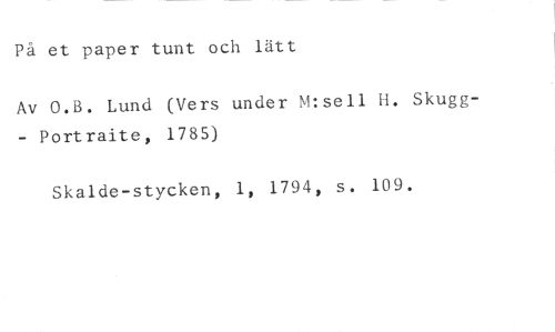 På et paper tunt och lätt //// Av O.B. Lund (Vers under M:sell H. Skugg- Portraite, 1785) //// Skalde-stycken, 1, 1794, s. 109.