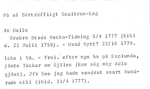 På så förträffligt Smultron-Lag //// Av Dalin //// Örebro Stads Wecko-Tidning 5/4 1777 (Kihl d. 22 Julii 1759). - Hvad Nytt? 22/10 1779. //// Icke i VA. - Trol.'efter ngn hs på Esplunda, jämte Tankar om Själen (Kom säg mig ädla //// gjäst). Jfr Sen jag hade vandrat snart hundrade mihl (ibid. 11/4 1777).