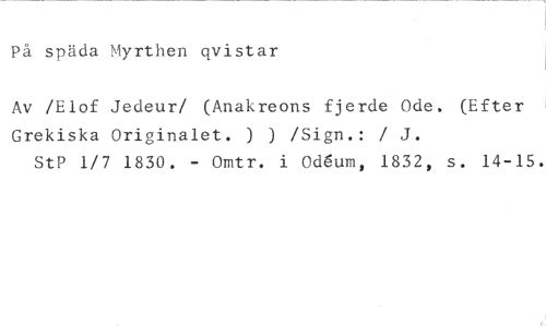 På späda .yrthen qvistar //// Av /Elof Jedeur/ (Anakreons fjerde Ode. (Efter Grekiska Originalet. ) ) /Sign.: / J. //// StP 1/7 1830. - Omtr. i Odgum, 1832, s. 14-15.