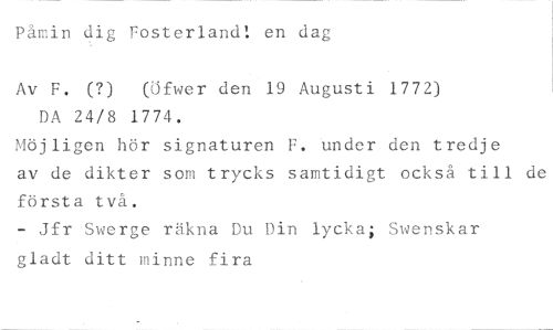 Påmin dig Fosterland! en dag //// Av F. (?) (Öfwer den 19 Augusti 1772) //// DA 24/8 1774. //// Möjligen hör signaturen F. under den tredje //// av de dikter som trycks samtidigt också till de //// första två. //// - Jfr Swerge räkna Du Din lycka; Swenskar //// gladt ditt minne fira