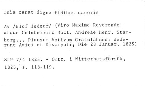 Quis canat digne fidibus canoris //// Av /Elof Jedeur/ ( Viro Maxime Reverendo atque Celeberrimo Doct. Andreae Henr. Stam- //// berg... Plausum Votivum Gratulabundi dederunt Amici et Discipuli; Die 28 Januar. 1825) //// StP 7/4 1825. - Omtr. i Witterhetsförsök, 1825, s. 118-119.