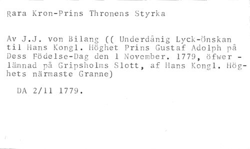 Rara Kron-Prins Thronens Styrka //// Av J.J. von Bilang (( Underdånig Lyck-önskan til Hans Kongl. Höghet Prins Gustaf Adolph på Dess Födelse-Dag den 1 November. 1779, öfwer lämnad på Gripsholms Slott, af Hans Kongl. Höghets närmaste Granne) //// DA 2/11 1779.