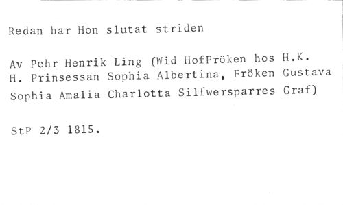Redan har Hon slutat striden //// Av Pehr Henrik Ling (Wid HofFröken hos H.K. //// H. Prinsessan Sophia Albertina, Fröken Gustava //// Sophia Amalia Charlotta Silfwersparres Graf) //// StP 2/3 1315.