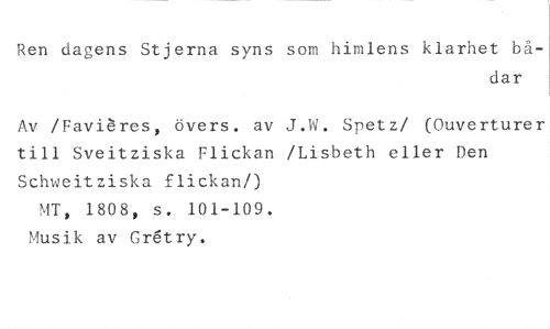Ren dagens Stjerna syns som himlens klarhet bå- //// dar //// Av /FaviAres, övers. av J.W. Spetz/ (Ouverturer till Sveitziska Flickan /Lisbeth eller Den Schweitziska flickan/) //// MT, 1808, s. 101-109. Musik av Gr6try.