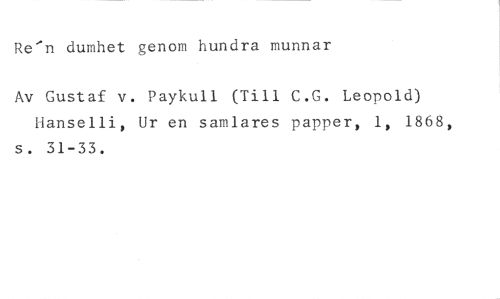 Re'n dumhet genom hundra munnar //// Av Gustaf v. Paykull (Till C.G. Leopold) lianselli, Ur en samlares papper, 1, 1868, s. 31-33.