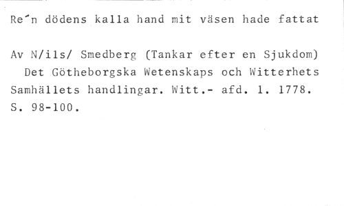 Re'n dödens kalla hand mit väsen hade fattat //// Av N/ils/ Smedberg (Tankar efter en Sjukdom) Det Götheborgska Wetenskaps och Witterhets Samhällets handlingar. Witt.- afd. 1. 1778. S. 98-100.