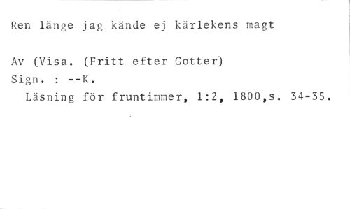Ren länge jag kände ej kärlekens magt //// Av (Visa. (Fritt efter Gotter) Sign. : --K. //// Läsning för fruntimmer, 1:2, 1800,s. 34-35.