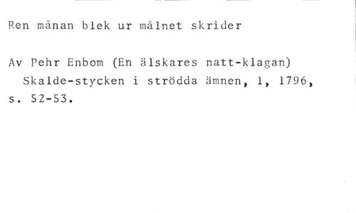 Ren månan blek ur målnet skrider //// Av Pehr Enbom (En älskares natt-klagan) Skalde-stycken i strödda ämnen, 1, 1796, s. 52-53.