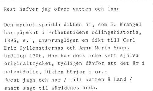 Rest hafver jag öfver vatten och land //// Den mycket spridda dikten är, som E. Wrangel har påpekat i Frihetstidens odlingshistoria, 1895, s. , ursprungligen en dikt till Carl Eric Gyllenstiernas och Anna Maria Soops bröllop 1706. Han har dock icke sett själva originaltrycket, tydligen därför att det är i patentfolio. Dikten börjar i or.: //// Reest jagh och har / till Watten å Land / snart sagt til wärldenes ända.