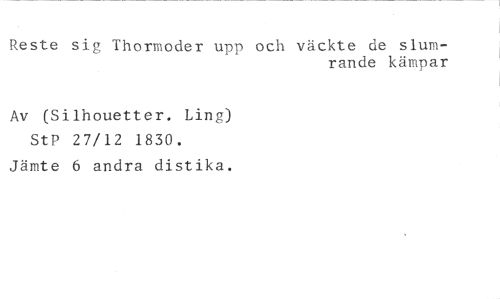 Reste sig Thormoder upp och väckte de slum- //// rande kämpar //// Av (Silhouetter. Ling) StP 27/12 1830. //// Jämte 6 andra distika.