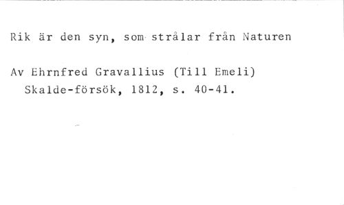 Rik är den syn, som strålar från Naturen //// Av Ehrnfred Gravallius (Till Emeli) Skalde-försök, 1812, s. 40-41.