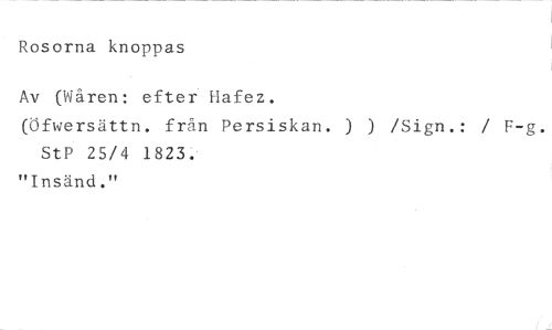 Rosorna knoppas //// Av (Wåren: efter Hafez. //// (Öfwersättn. från Persiskan. ) ) /Sign.: / StP 25/4 1823. //// "Insänd."