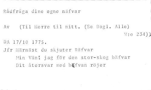 Rådfråga dine egne näfvar //// (Til Herre til mitt. (Se Dagl. Alle) //// N:o 234)) //// DA 17/10 1775. //// Jfr Härnäst du skjuter Räfvar //// Min Vän: jag för den stor-skog bäfvar //// Dit återsvar med bUvan röjer