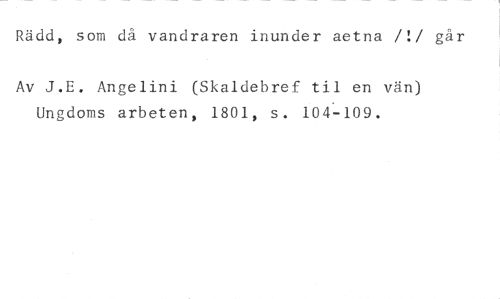 Rädd, som då vandraren inunder aetna /!/ går //// Av J.E. Angelini (Skaldebref til en vän) Ungdoms arbeten, 1801, s. 104-109.