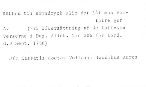 Rättnu til sömndryck blir det låf man Vol- //// taire ger //// Av (Fri öfwersättning af de Latinska //// Verserne i Dag. Alleh. N:o 206 för Lörd. d.9 Sept. 1780) //// Jfr Lassatis doctas Voltairi laudibus aures