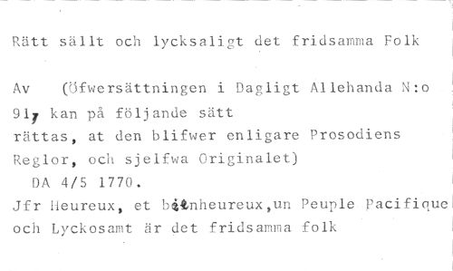 Rätt sällt och lycksaligt det fridsamma Folk //// Av (öfwersättningen i Dagligt Allehanda N:o //// 917 kan på följande sätt //// rättas, at den blifwer enligare Prosodiens Reglor, och sjelfwa Originalet) //// DA 4/5 1770. //// Jfr Heureux, et hitnheureux,un Peuple Pacifiquel och Lyckosamt är det fridsamma folk