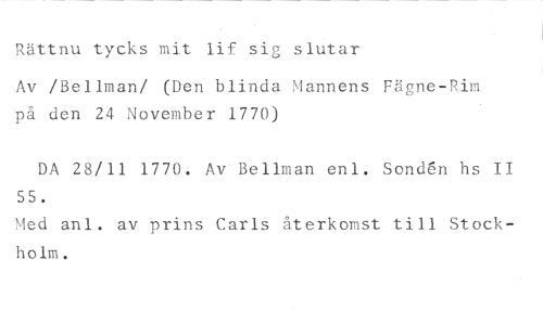 Rättnu tycks mit lif sig slutar //// Av /Bellman/ (Den blinda Mannens Fägne-Rim på den 24 November 1770) //// DA 28/11 1770. Av Bellman enl. Sond6n hs II 55. //// Med anl. av prins Carls återkomst till Stockholm.