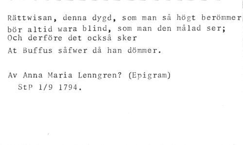 Rättwisan, denna dygd, som man så högt berömmer, //// bör altid wara blind, som man den målad ser; Och derföre det också sker //// At Buffus såfwer då han dömmer. //// Av Anna Maria Lenngren? (Epigram) StP 1/9 1794.