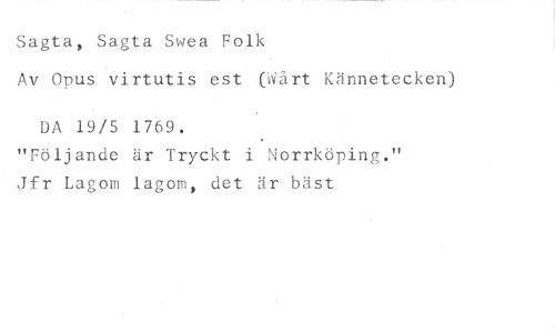 Sagta, Sagta Swea Folk //// Av Opus virtutis est (vårt Kännetecken) //// DA 19/5 1769. //// "Följande är Tryckt i Norrköping." Jfr Lagom lagom, det är bäst