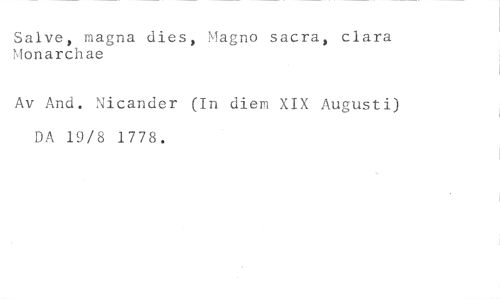 Salve, magna dies, Magno sacra, clara Monarchae //// Av And. Nicander (In diem XIX Augusti) DA 19/8 1778.