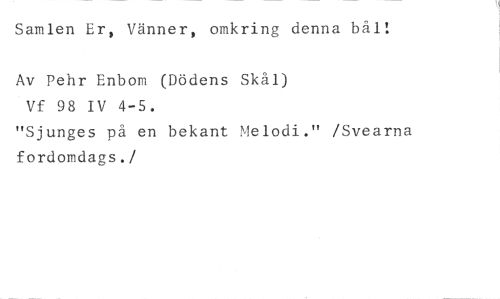 Samlen Er, Vänner, omkring denna bål: //// Av Pehr Enbom (Dödens Skål) //// Vf 98 IV 4-5. //// "Sjunges på en bekant Melodi." /Svearna fordomdags. //// /